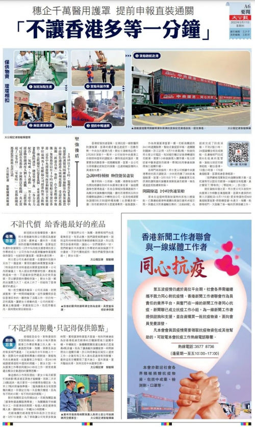 就在货船出发之前,邦士度公司又收到中央援港工作组数百万个眼罩、面罩生产保供的第三次调配函。3月17日起,更多物资包括500万个眼罩面罩,将陆续发运,生产方、海关、船务等部门,又启动了新一轮的供港保畅工作。