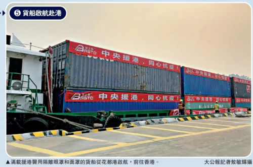 各部门高效协同,邦士度公司根据中央援港专班的两次调配函,分四批供应了300多万个眼罩、面罩。3月15日下午,满载着第五批供港防护物资的货柜车车队抵达花都港,绿色通道直抵船边装卸区。